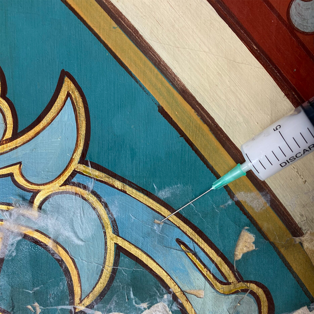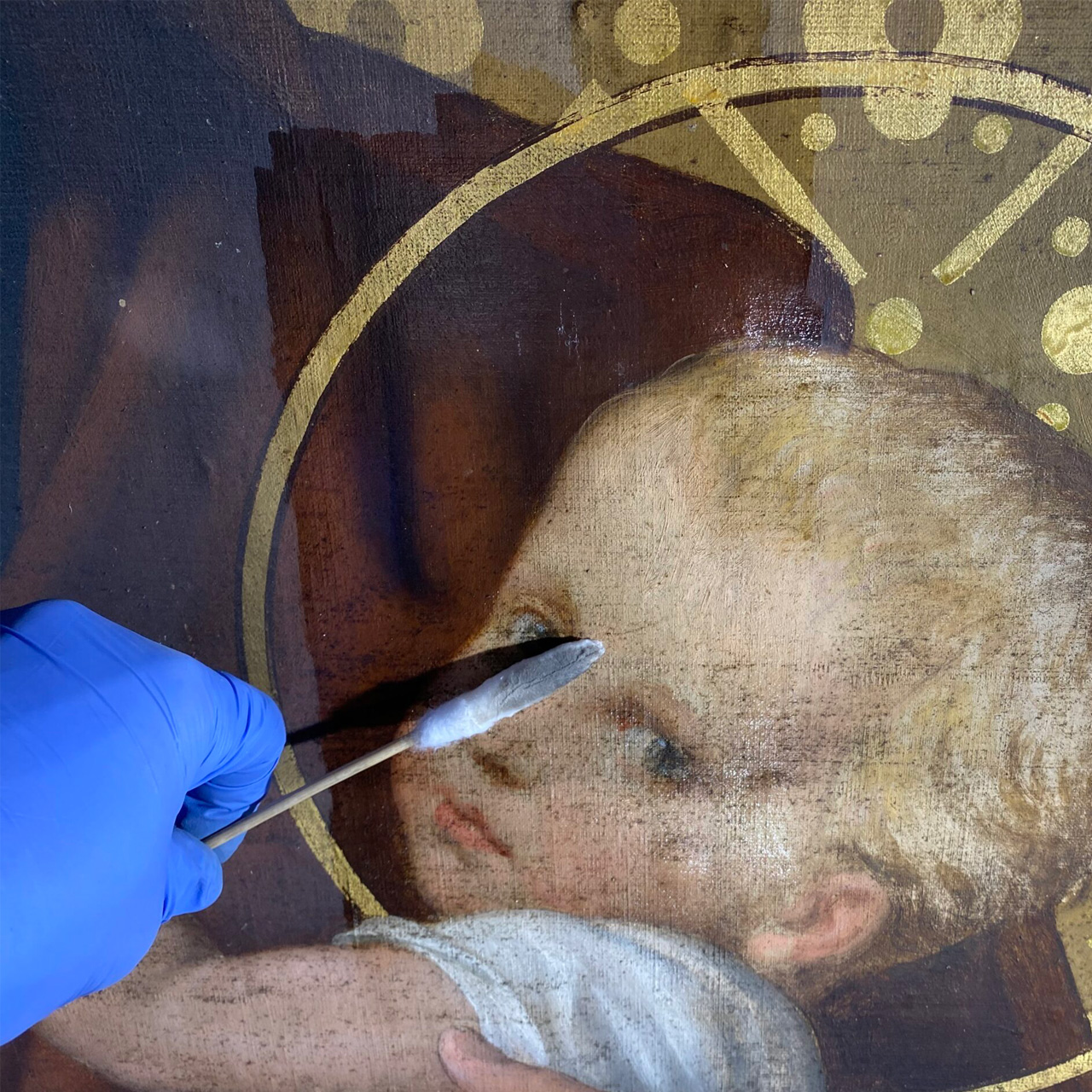 Je travaille sur la restauration du support (toile, bois, cartons …) et de la couche picturale. Je fais appel à des collègues restaurateurs spécialisés pour des cas spécifiques.